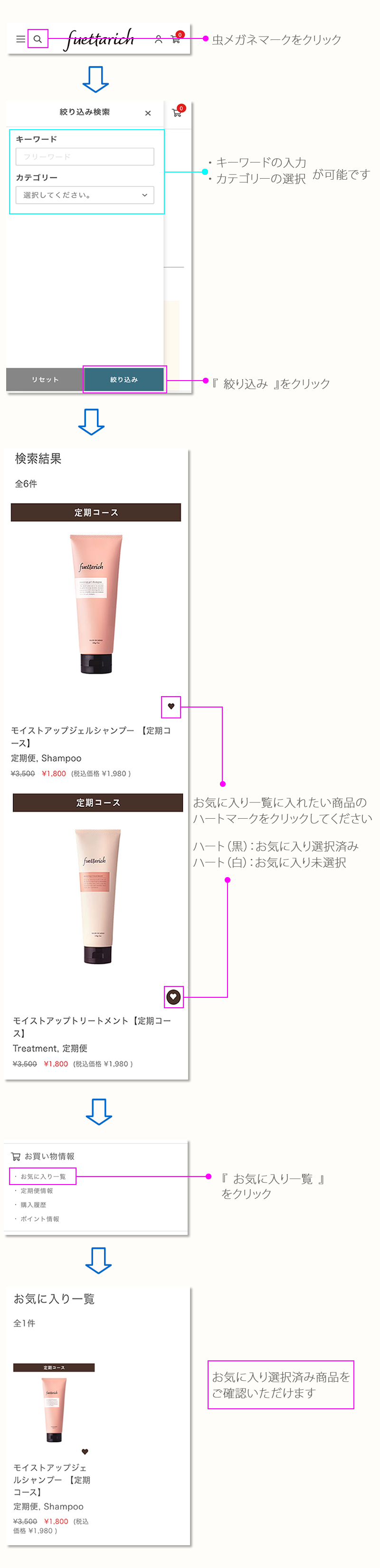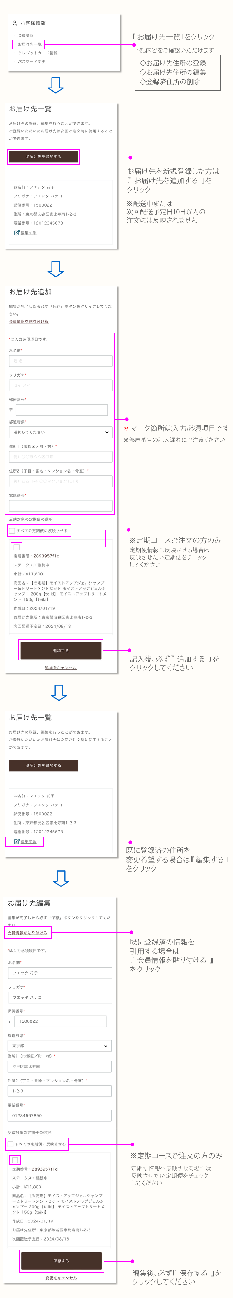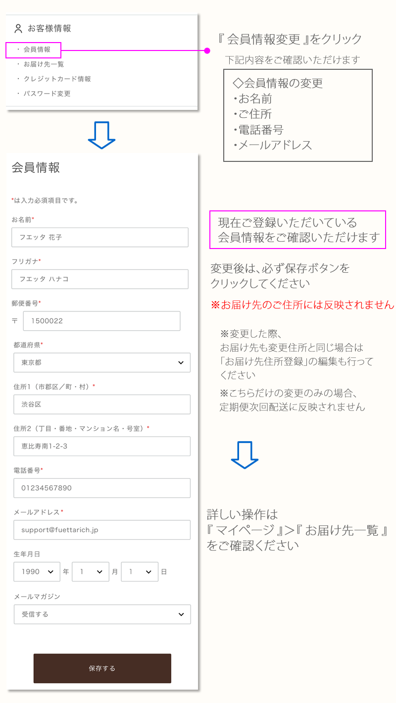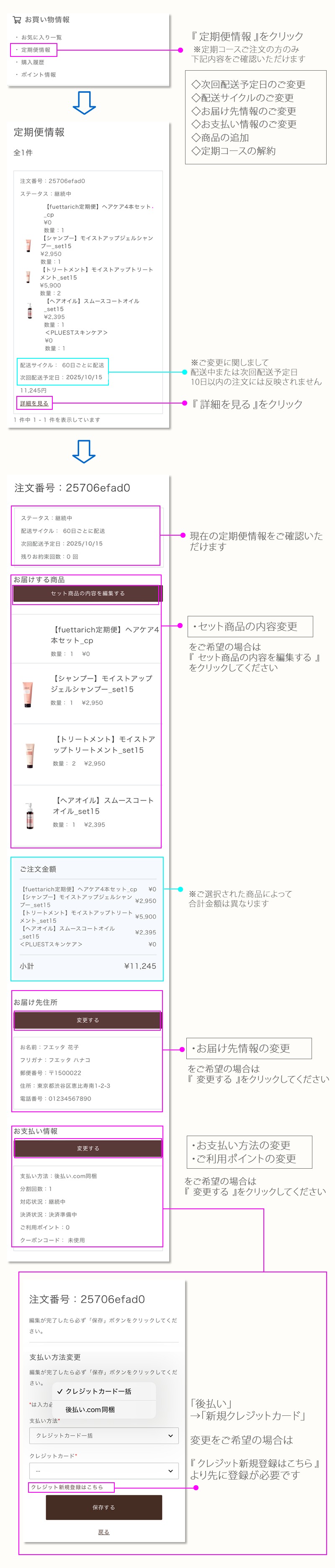 1. お気に入り一覧 ▶ 2. 定期便情報 ▶ 3. 購入履歴 ▶ 4. ポイント情報 ▶ 5. 会員情報 ▶ 6. お届け先一覧 ▶ 7. クレジットカード情報 ▶
